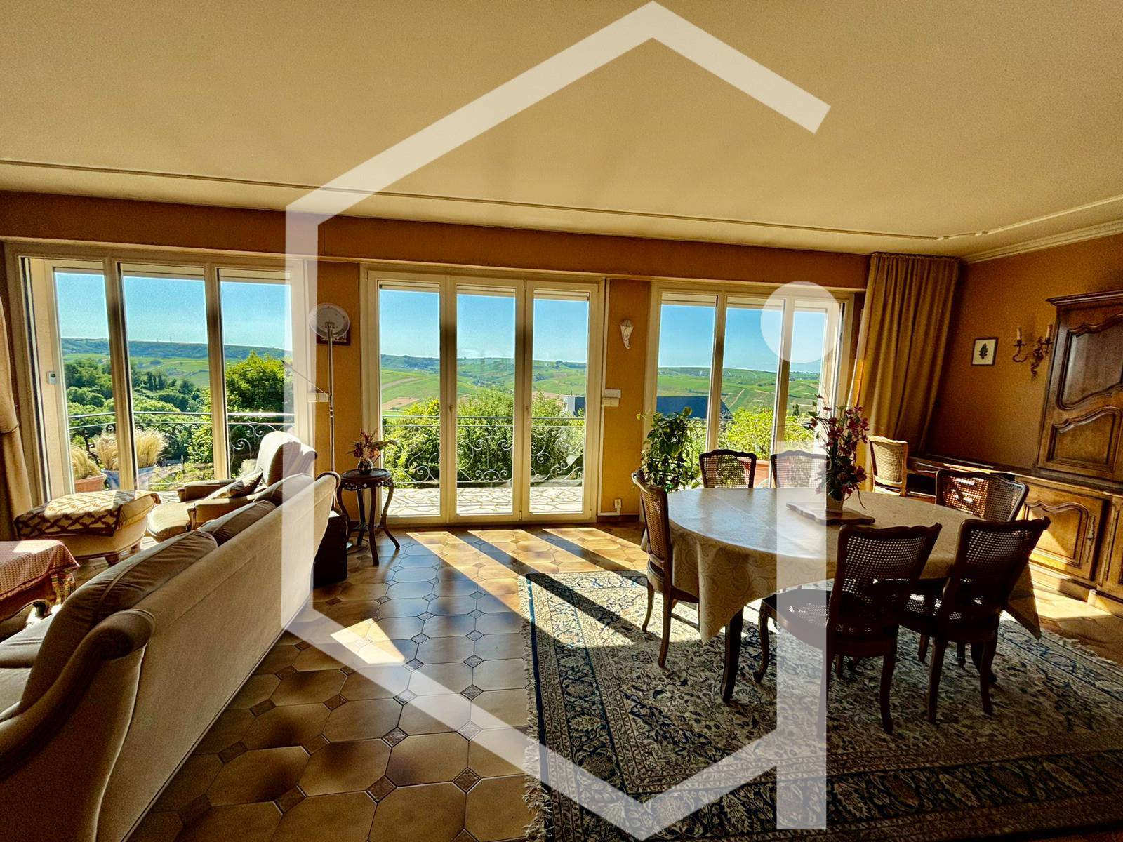 Au rez-de-chaussée, vous trouverez une entrée accueillante, un salon lumineux, une salle à manger avec accès direct à un balcon-terrasse dominant le paysage viticole, ainsi qu’un garage attenant, pratique et sécurisé.
